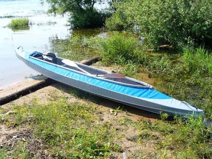 Оболочка для байдарки Таймень 2 сшита из ткани ПВХ. Оболочка проклеена по всем стрингерам, и кильсону ПВХ профилем шириной 50 мм. Кронштейн для установки руля не предусмотрен.